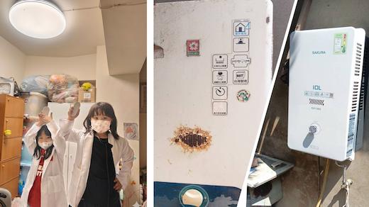 家扶居家生活環境改善計畫,協助家庭進行房屋修繕、水電維護與設備汰換,近三年服務超過2,000戶家庭,圖左起為家扶社工訪視發現照明不足應用計畫替換屋內燈具、更新老舊熱水器。圖 / 家扶基金會提供