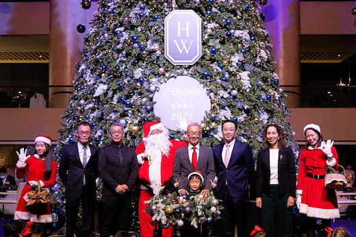27日這棵全台飯店室內最高的聖誕樹,在歐洲學校合唱團優美的歌聲以及聖誕老公公溫暖祝福聲中點亮,傳遞佳節祝福與希望。儀式由Harry Winston亞太區副總裁曾文湘、台北歐洲學校英國小學部校長Ms. Siobhain Allum、Ginza Sand創辦人森本龍一與晶華國際酒店集團董事長潘思亮、營運長吳偉正共同點亮。