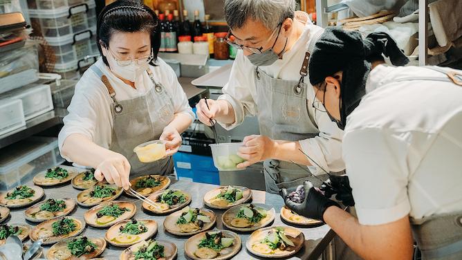 工研院協助農民以科技將農業剩餘優質資材活化再利用,將許多農產品加值為創意食材,圖為2024米其林推薦主廚林祺豐(中),將原鄉小米轉化為精緻創意料理,成功提升價值。圖 / 工研院提供