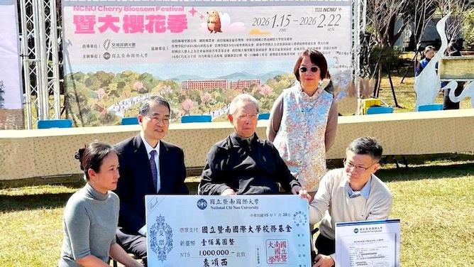 尤其,今年在暨大校內著名景點櫻花林下,有場深具歷史意義的捐贈儀式,為今年櫻花季綻放新亮點。1月28日暨大首任校長袁頌西重返這片30年前,由他親手開闢的校園,親贈新臺幣100萬元做為暨大校務發展基金。這份溫暖的「回饋」,不僅象徵教育薪火相傳,同時見證暨大與埔里基督教醫院產學合作照護高齡長者的具體成效。