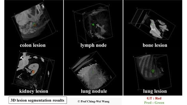 王靖維說,團隊研究開發通用3D病灶分割AI模型,可精準辨識多類別胸腹部,包括骨骼、胰臟、腎臟、肝臟、肺結節、肺部、結腸、淋巴結和縱膈等病灶,適用胸腹部CT影像,可自動化精準標註多種3D CT病灶,幫助放射科醫師以3D形式標註病灶,解決手動標註耗費大量人力成本問題。