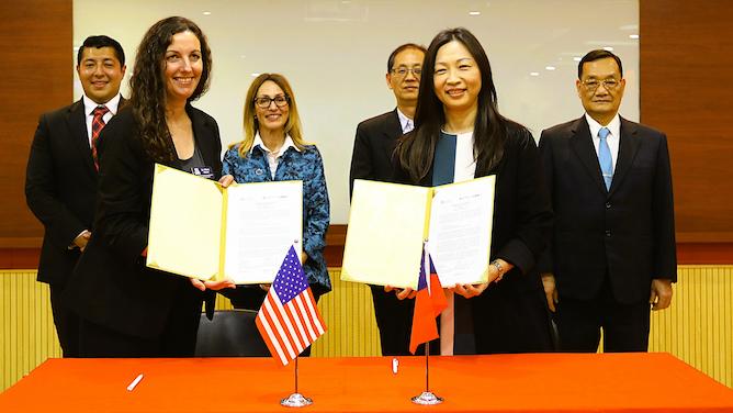 暨大與亞利桑納大學簽署合作備忘錄,圖右起為暨大國際長葉家瑜與UA國際事務副校長李珍妮(Professor Jenny Lee)代表兩校簽約合作。圖 / 暨大提供