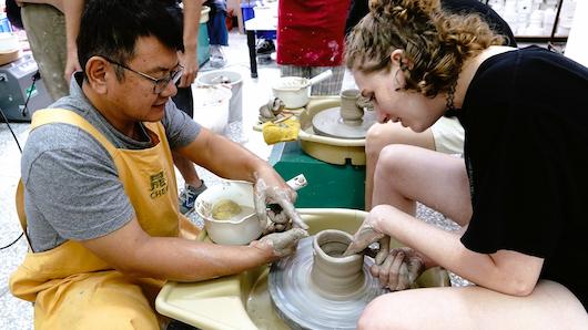 南投法陶藝家陳元杉,應邀至北科大校內陶藝室教授拉大坯。圖 / 北科大提供