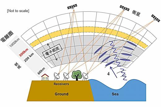 電離層位於距地60-1000公里的高度,是大氣中最易受到地面擾動影響的區域。當大型地震與海嘯發生時,地表與海面的劇烈變動會向上激發聲波、雷利波與內重力波,進而在電離層造成可被觀測的電子密度擾動,稱為地震電離層同震擾動(Co-seismic Ionospheric Disturbances, CIDs)。