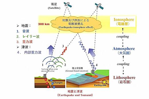 地震與海嘯引起岩石圈—大氣層—電離層耦合。圖 / 日本千葉大學教授服部克巳提供