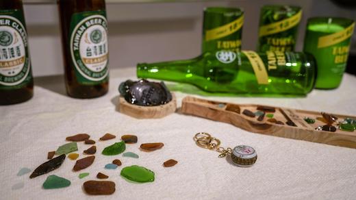 黃珮翊、廖翊婷與張皓翔的「海啤拾光」,以臺灣海岸常見的綠、棕色海玻璃為意象,呼應啤酒瓶的色彩記憶。透過切割、打磨與再造,讓回收玻璃化身小夜燈、香氛蠟燭與花盆,將被丟棄的物件重新帶回生活日常,實踐循環經濟與資源再生,也讓啤酒文化以光影、香氣與綠意回流日常生活,形塑永續美學。
