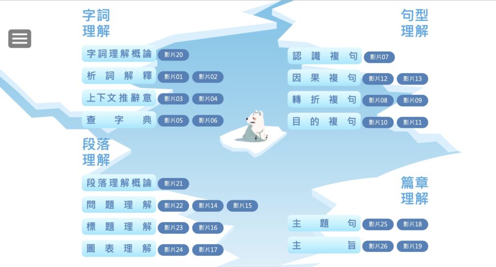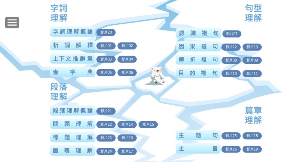 這套示例內容包括課文區、自學區與遊戲區。 以自學區為例,從引導學習者理解文本中的字詞、字句、段落與篇章,到對分詞、關聯詞、因果複句與轉折複句等的瞭解,最後,循序漸進到對整篇文章的瞭解。課前有影片、課後有自我評量,自習者透過反覆練習,便可學會課文內容。