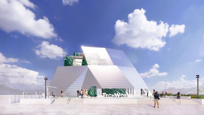 貿易署指出TECH WORLD館的七大亮點。首先,建築外觀呈現「心之山」意象。以群山象徵臺灣多元文化與豐富自然生態,展館採用環保金屬板折射光影呈現山形的壯麗雄偉,寓意每個人心中的願景與共好起點。