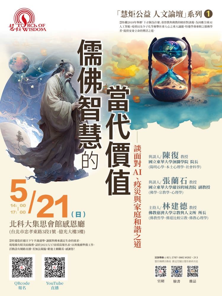 慧炬公益人文論壇系列,5月21日下午兩點首場活動將開跑,主題是「儒佛智慧的當代價值--面對AI、疫災與家庭和諧之道」。開放各界免費參加,讓儒佛對話滿足心靈的需求,現場也準備精美結緣禮物,地點在北科大集思會館感恩廳。