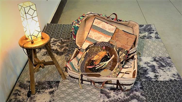 就像畫裡的滷味鍋所在的西方廚房,與行李箱所裝置的空間一樣,可能是世界上任何一個異鄉的旅宿房間;以傳統工藝手法製作的貼布繡畫,在不同的文化環境中顯得更加的格格不入。