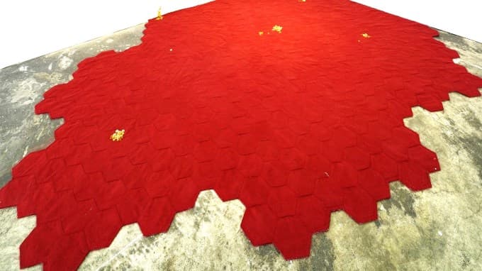《家傳食譜》中有一件〈廚房〉(2020,圖1)的裝置作品,是以舊公寓廚房地磚為靈感,暗示一整間的廚房場景的裝置。以拼布詮釋的六角型地磚構成,好像是廚房地磚正在裝修中,也好像是正要拆到一半的樣子,鋪陳著空間中可能的敘事。磚紅色地磚的表面,凝結著一瘩一瘩亮晃晃的油汙,我使用黃色花型的玻璃珠飾構成點滴的油汙,因為這些油膩的結晶是美麗的,是廚房辛勤工作累積的痕跡。