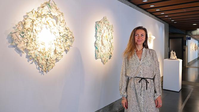 藝術家蘿拉.迪莫娃(Lora Dimova)來自保加利亞,目前長居芬蘭,以陶瓷雕塑、裝置藝術、繪畫與影像等多元創作聞名。作品靈感來自「毀滅與重生、斷裂與生成」的自然變化,透過材質轉換,營造一場場宛若無聲的舞蹈,留下時間與大地的記憶。