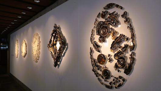 〈分岐〉、〈瓦解〉、〈紀念〉則由陶瓷碎片重組成花冠,邊緣捲曲、破裂卻又交織成完整的形體。白中帶著釉色的青綠,如同自然界岩層與水流痕跡,呼應蘿拉所追尋的「脆弱與不完美」的美:經歷斷裂與重構後,留下的不是缺陷而是再生的力量。