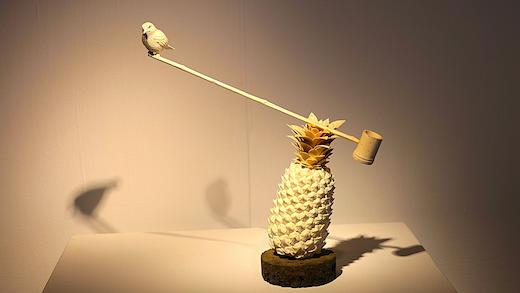 一顆臺灣鳳梨立起一隻小鳥;滿身粉紅花簇的花仙子彷彿在悄悄迎接春天;粗獷有力的岩石造型,宛若瞬間凝結的大自然奔流,原來屋瓦、植物甚至日常水果,都能成為陶藝家的創作故事。