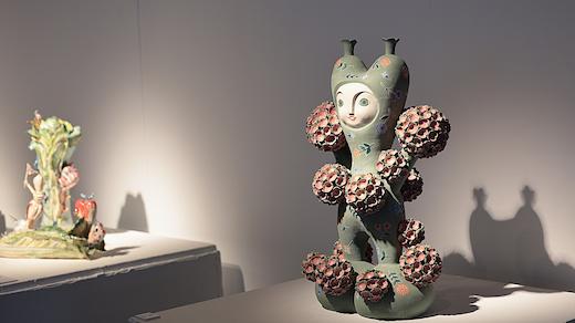 泰國駐村藝術家卡蒙莎奴・潘維德(Kamonchanok Panuwed)以柔和的綠色塑造《我的第一個春天》,童話般的人形,綻放出層層粉紅花團;以細緻花草紋樣點綴,呈現春天甦醒、生機初綻的意象;日本駐村陶藝家小島修(Kojima Osamu)則將臺灣屋瓦與陶土記憶融入《懷舊16-TWT-s10》,以樸素造型凝結土地與人文的生活痕跡。