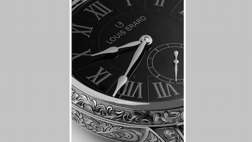 Gravée Main採極簡的 Louis Erard 設計語彙,將錶殻化為古典裝飾的畫布,甚至延伸至面盤。靈感源自巴洛克鐘錶,結合羅馬數字與梨形鍍銠指針詮釋現代;面盤低調內斂,以黑色亮面烤漆搭配深灰色與黑色轉印刻度與時標,營造微妙的層次感。