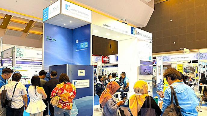 董事長廖禎松說,這次在印尼展出的海淡機與淡水淨化機,分別採用逆渗透與管式膜過濾技術,整合太陽能發電供電,日處理量分別可達2.5噸與12噸;採全天動力供電時,處理量更可提升到5噸與55噸,足堪供多個家庭使用,一推出展位門庭若市。