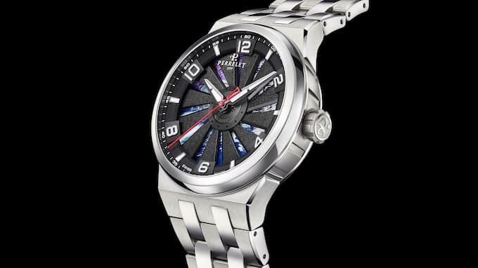 渦輪面盤由十二片經黑色陽極氧化處理的鋁製葉片組成,其中五片葉片的末端搭載用來平衡配重的鎢鋼砝碼。隨著手腕移動旋轉,十二片葉片轉動得越快,下層錶盤上的圖案就越清晰地展現出來。藉由旋轉葉片所創造出來的原創3D效果,讓人彷彿潛入面盤的核心之中,也賦予了每款Perrelet腕錶獨特且迷人的個性。