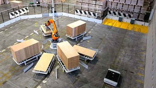 以建築業為例,奧地利Baubot公司開發了行動機器人系統,搭配KUKA機器人,解決營建工地技術工短缺與效率低落等問題。這套系統應用在奧地利的Koralm隧道專案,該隧道長達33公里,每隔3公尺需在離地面1~3公尺的高度鑽孔打洞,由KUKA機器人結合自走車在此負責快速、精確地鑽鑿超過11,000個扶手與電纜托盤孔洞,大幅提升了生產力並減輕了工人的體力負擔。