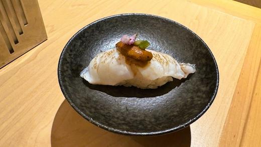 開場首道美味九繪魚煮凍,晶瑩凝脂中封存魚肉甘香並以魚子醬點綴;季節椀物則以大分縣產牡蠣與松茸入土瓶蒸,香氣濃郁、湯韻清雅,柚子皮與金桔添上爽冽尾韻。生魚片部分,郡司行雄應用九繪魚與黑鮪魚雙品,展現魚體油脂的滑順層次;主菜前以炙燒九繪魚壽司乘北海道生海膽來引發覺醒味蕾,炙香與海膽甘潤交融,細膩馥郁令人回味無窮。