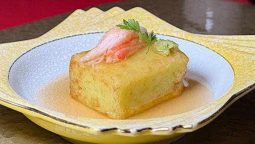整套會席依序展開,先付(さきづけ; sakizuke)烤銀杏豆腐以銀杏製成豆腐後再炙烤,口感綿密細緻,佐以松葉蟹肉與山葵醬提味,清雅開場。前菜一次呈現七品旬味,包括生食級甜蝦鹽麴和、口感如蜂蜜蛋糕般細緻的伊達卷、鱈子昆布小袖、燻製合鴨蔥卷、干柿博多甜柿搭配牛奶起司、菠菜豆腐醬以及鮟鱇魚肝有馬煮(Arima-ni),展現日料對季節食材與層次配置的細膩與講究。