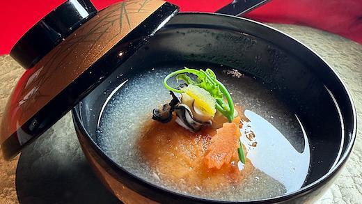 椀物(わんもの)宮城縣產牡蠣雨夾雪蘿蔔高湯,以昆布與柴魚慢熬高湯為底,搭配蘿蔔泥勾勒出如雪般的視覺意象,風味含蓄溫潤,並佐以起司麻糬享用,柔和銜接後續主菜節奏;造(お造り; otsukuri)則嚴選當令鮮魚,包含鮪魚、干貝與牡丹蝦,透過細緻刀工呈現食材純粹鮮甜。