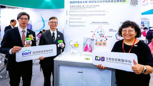 生技中心開發『新型抗發炎藥物 FPR1 拮抗劑』,能調節嗜中性白血球活性、降低肺部發炎反應,未來可望發展為吸入式劑型,為呼吸疾病治療提供全新選擇。左起生技中心李財坤執行長、經濟部產業技術司戴建丞簡任技正、生技中心李應宣所長。